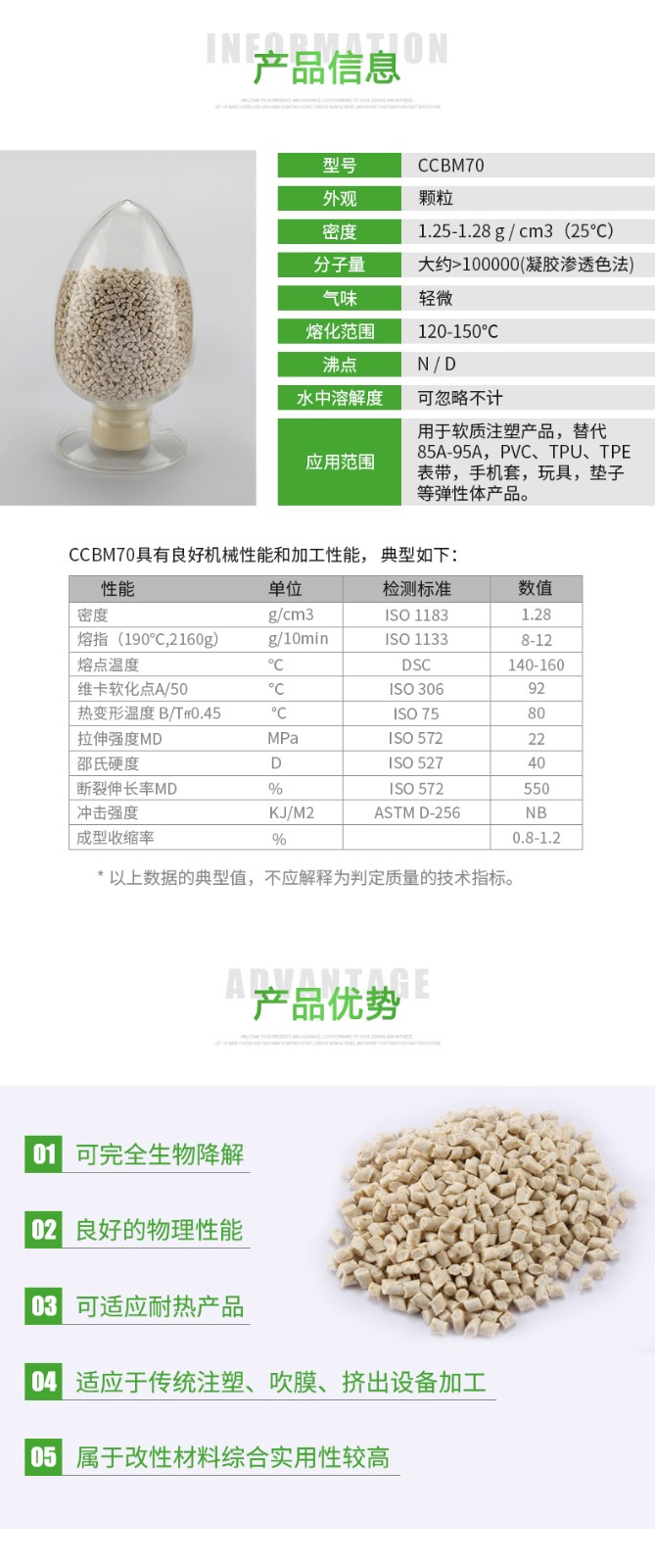 100000(凝膠滲透色法) 氣味;輕微 熔化范圍:20-150°℃ 沸點:N/D 水中溶解度:忽略不計 應(yīng)用范圍:用于軟質(zhì)注塑產(chǎn)品,替代85A-95A,PVC、TPU、TPE表帶,手機(jī)套,玩具,墊子等彈性體產(chǎn)品。" />